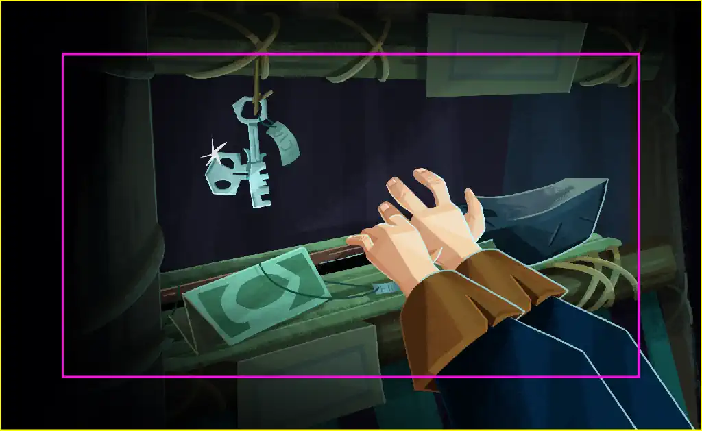 An unused close-up from the resource files shows Guybrush grabbing a key, shovel, and a map(?). This scene was completely cut from the game.